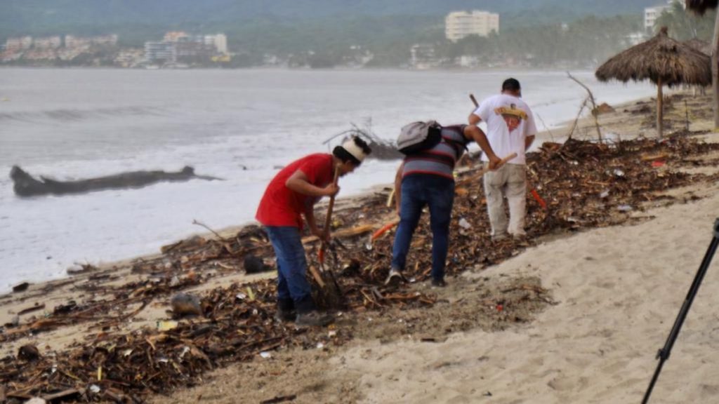 «Por instrucciones del presidente municipal, doctor Jaime Cuevas y ante la cantidad de desechos que arrojan las fuertes corrientes de ríos y arroyos que desembocan en nuestra bahía por las lluvias recientes, iniciamos trabajos a las 7 de la mañana en la playa de Bucerías Centro, apoyándonos para las tareas manuales de limpieza con el personal del programa de Empleo Emergente, retirando 6 toneladas de plásticos y basura», señaló el Jefe de Playas Limpias, doctor Jesús Arreola.