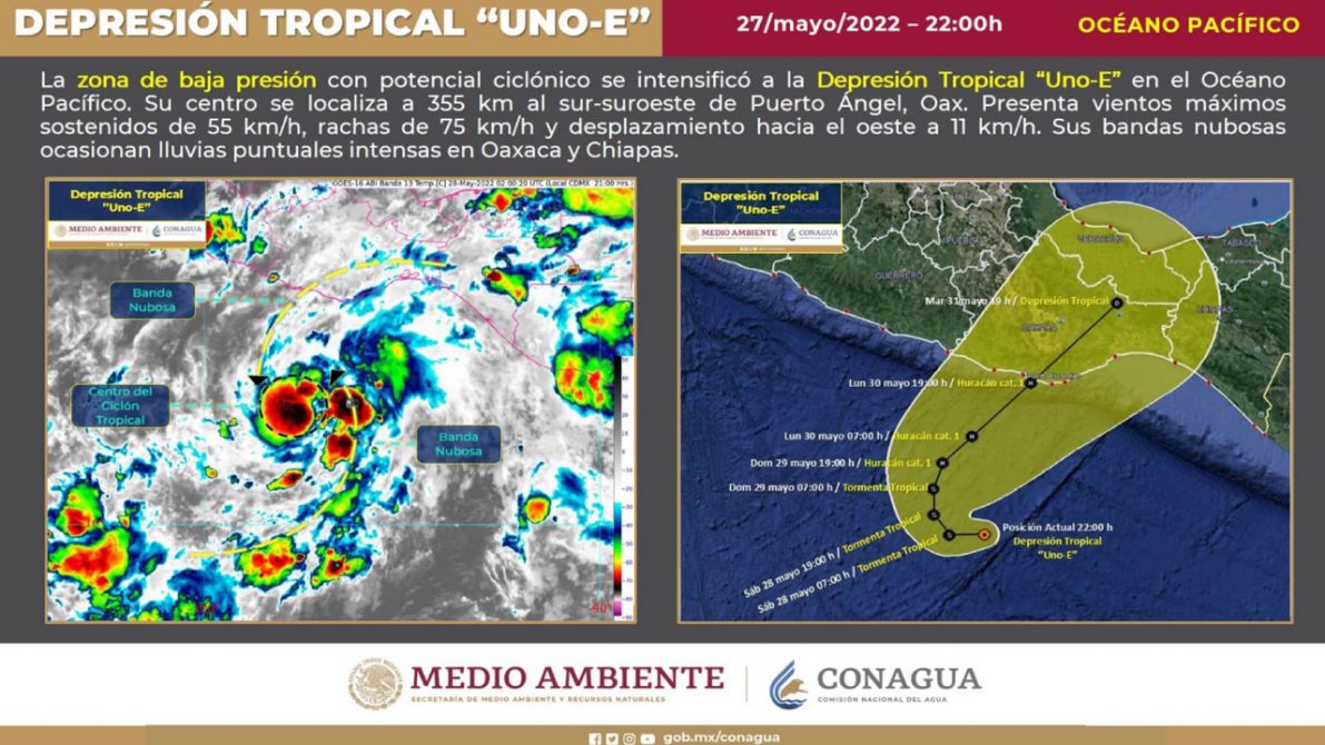 Comunicado | A las 22:00 horas, tiempo del centro de México, la zona de baja presión ubicada en el Océano Pacífico con 90% de probabilidad de desarrollo ciclónico, se intensificó a la Depresión Tropical Uno-E, dando origen al primer ciclón tropical de la temporada en dicha cuenca.