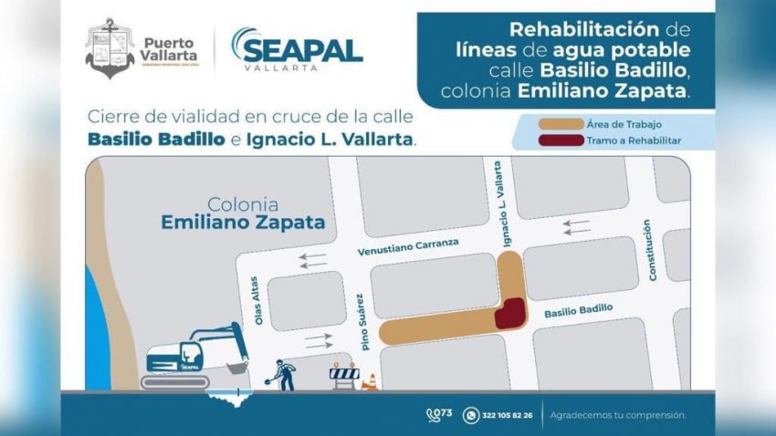 El Sistema de Agua Potable, Drenaje y Alcantarillado (SEAPAL) de Puerto Vallarta, trabajará a partir de las 23:00 horas de este lunes 7 de noviembre en la calle Basilio Badillo esquina Ignacio L. Vallarta, colonia Emiliano Zapata, lo que ocasionará restricciones a la circulación vehicular hasta las 6:00 horas del martes 8.