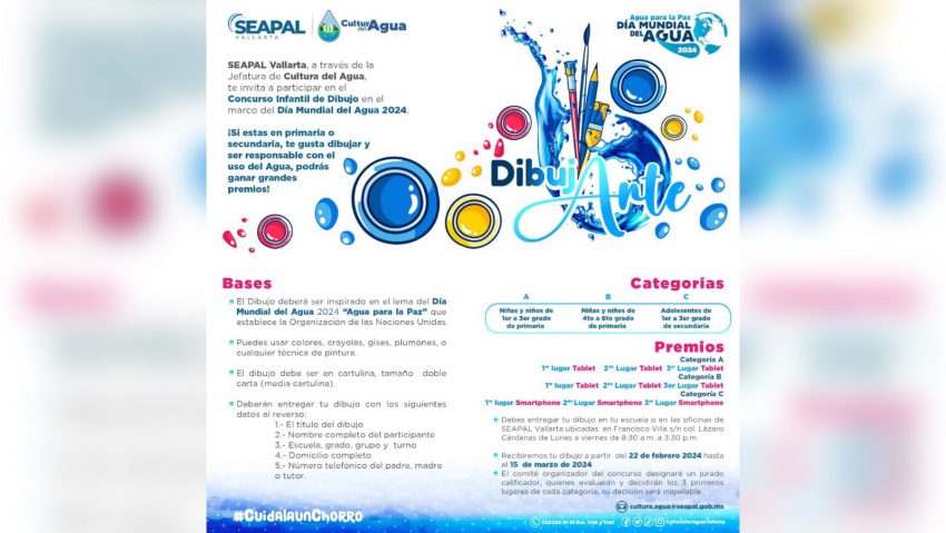 Este viernes 15 de marzo es el día límite de inscripciones para participar en los concursos de Dibujo y Fotografía de SEAPAL Vallarta, en el marco de los festejos en conmemoración por el Día Mundial del Agua 2024, que en esta edición tiene como lema “Agua para la Paz”, establecido por la Organización de las Naciones Unidas (ONU).