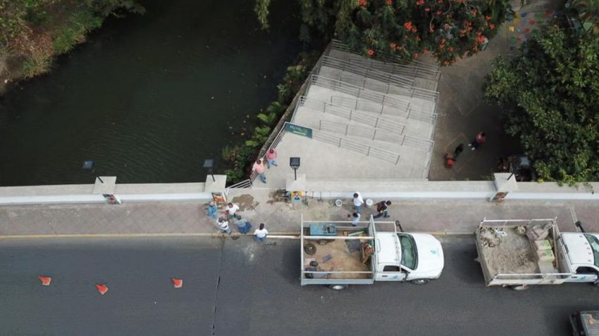 En estas tareas se trabajó bajo especial cuidado para salvaguardar el estado de los detalles ornamentales de los pilares, en los cuales está replicada la obra y estilo del artista vallartense Manuel Lepe, así como de las escaleras tipo rampa peatonal que dan acceso a la Isla del río Cuale.