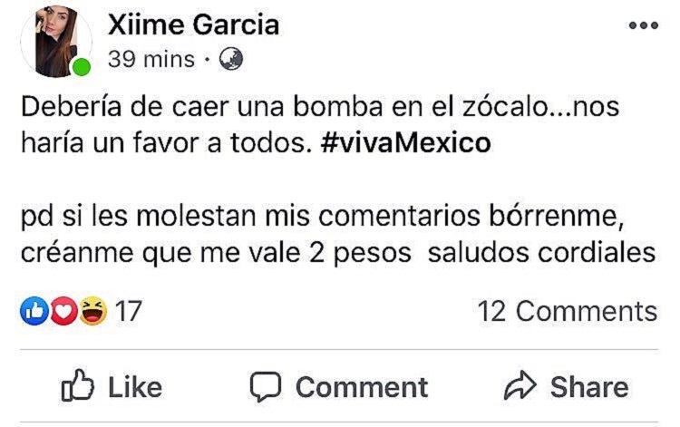 En las redes la usuaria de Facebook fue identificada como Ximena García, quien en esta red social publicó: “Debería de caer una bomba en el zócalo…. Nos harían un favor a todos”. La publicación fue viralizada inmediatamente y los reclamos a la empresa no se hicieron esperar.