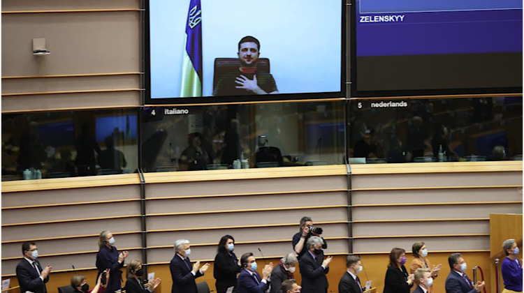 Los parlamentarios de la Unión Europea, muchos de ellos con camisetas en las que se leía #juntoaUcrania con a la bandera de dicho país, se pusieron de pie para hacerle una ovación.
