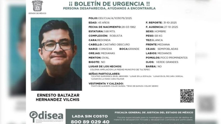 La FGJEM el 31 de octubre emitió boletín de urgencia para localizar a Ernesto Baltazar Hernández Vilchis, quien desapareció el 27 de ese mes, luego de ser visto por última vez en la colonia Ampliación La Piedad, en el municipio de Tultepec.
