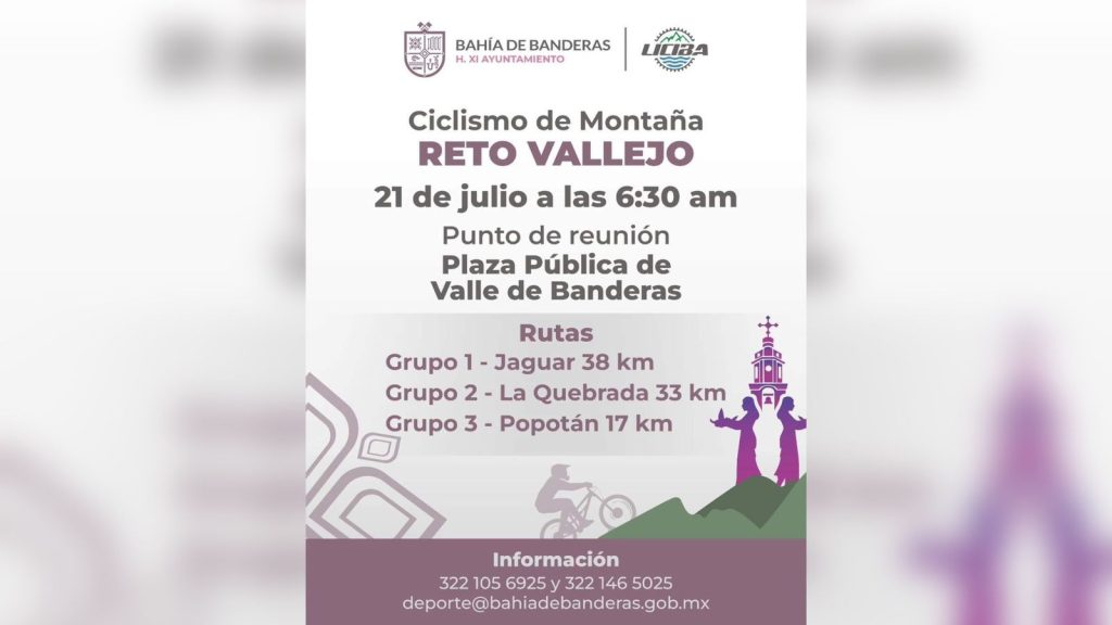 Esta rodada de ciclismo de montaña, se llevará a cabo el próximo 21 de julio. El punto de reunión para iniciar con el Reto Vallejo será la plaza pública de Valle de Banderas a las 6:30 de la mañana.