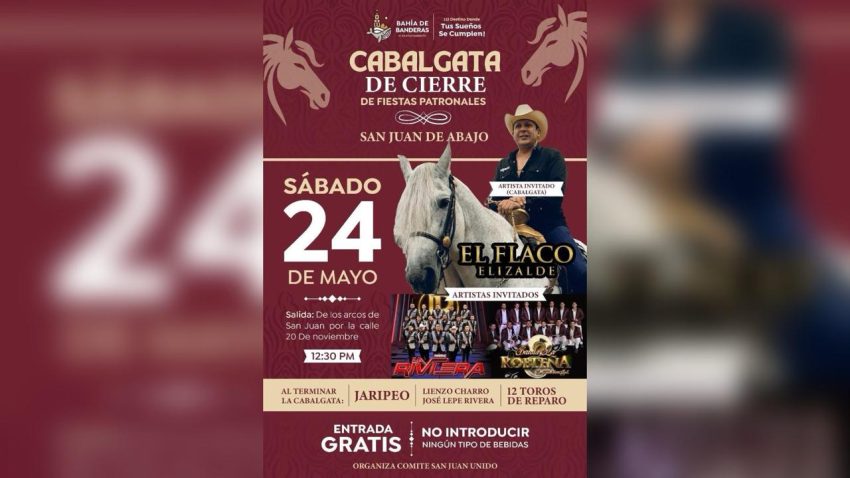 El presidente municipal de Bahía de Banderas convocó a las familias a participar este sábado 24 de mayo en la tradicional cabalgata de cierre de las fiestas patronales, que contará con música, jaripeo y la participación especial de El Flaco Elizalde.