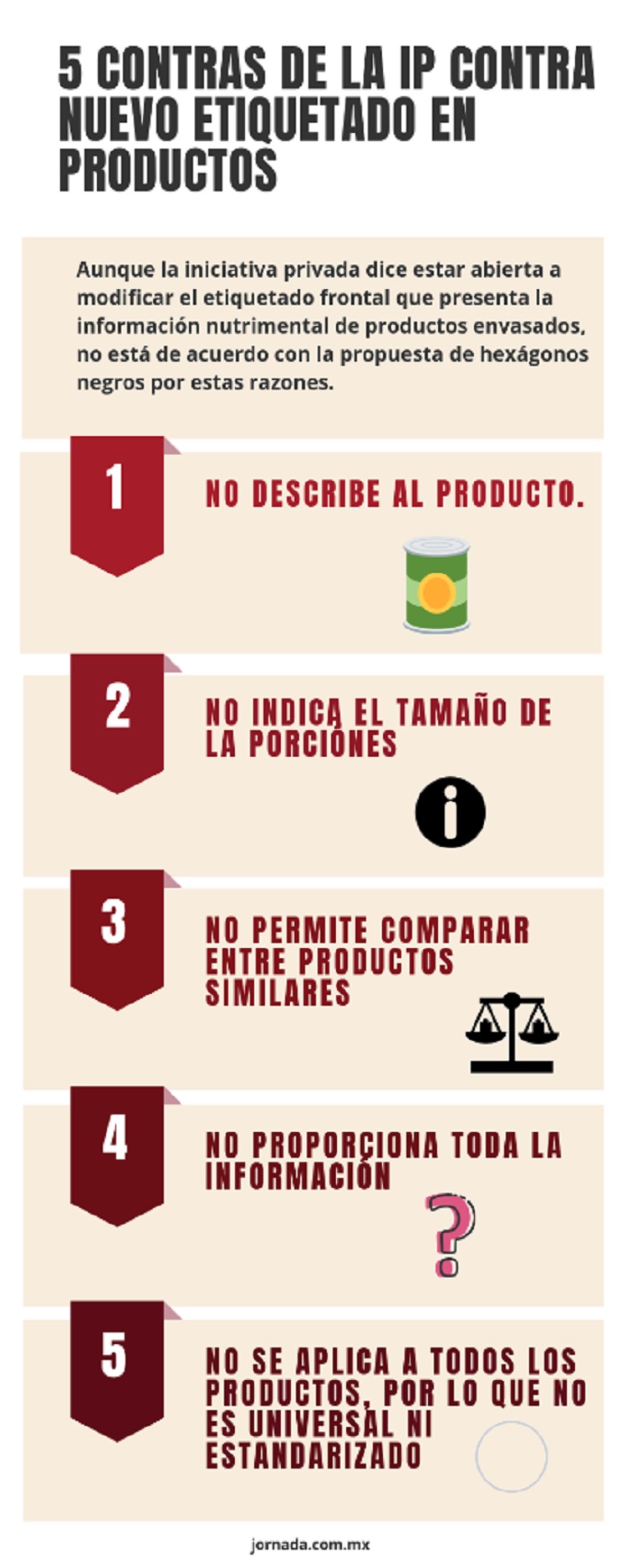 Destacó que la IP no se opone al etiquetado negro de advertencia, sino a que no se detalla. Pese a ello, comentó que no cuentan con una contrapropuesta a los hexágonos negros, pues hay muchos gráficos con los que se puede construir un nuevo etiquetado.