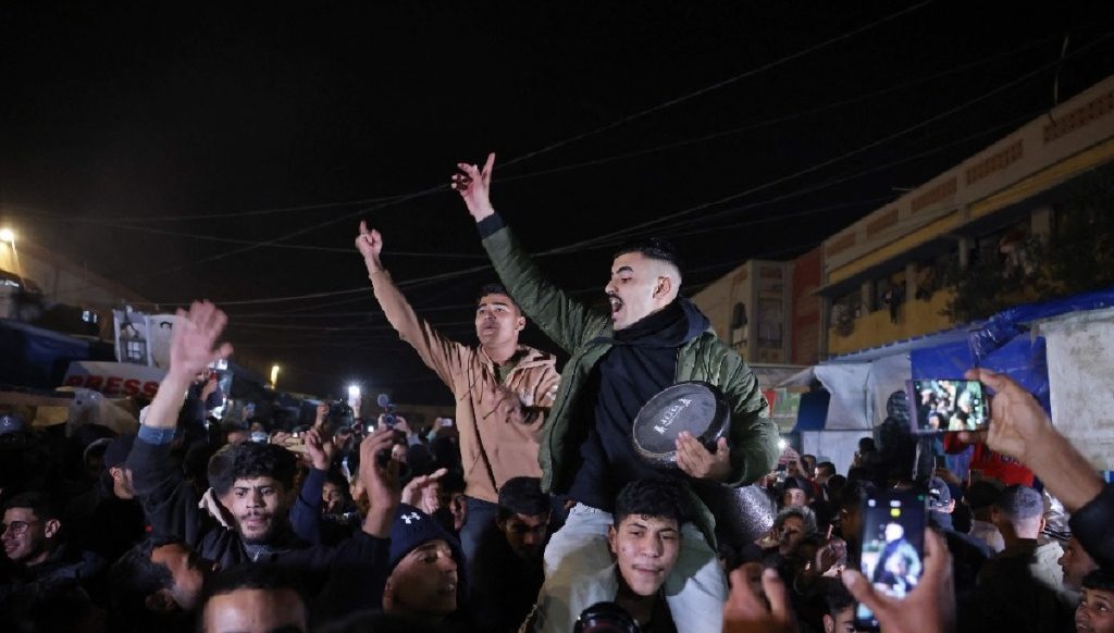 El anuncio del pacto fue recibido con lágrimas y gritos de júbilo en la franja. Estallaron celebraciones en Deir Balah y cientos manifestaron su alegría frente al hospital Mártires de Al Aqsa; la gente bailaba, se hacía fotos y ondeaba banderas palestinas.