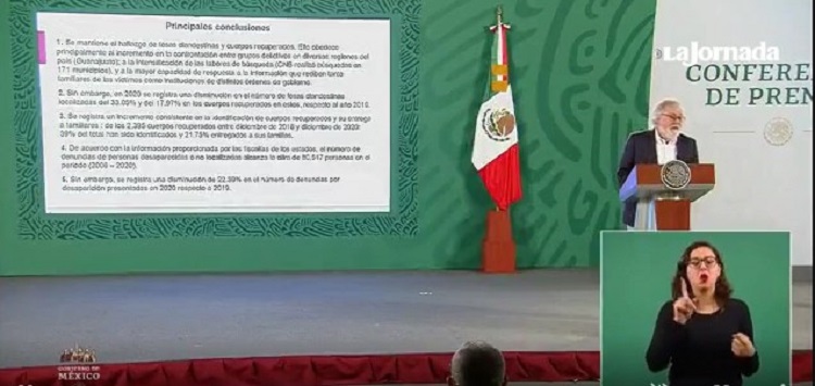 “Sin embargo, en 2020 se registra una disminución en el número de fosas clandestinas localizadas del 33.05 por ciento, y del 17.97 por ciento en los cuerpos recuperados en estos, respecto al año 2019”, se indica en el informe expuesto por el subsecretario de Derechos Humanos, Población y Migración de la SG, Alejandro Encinas.
