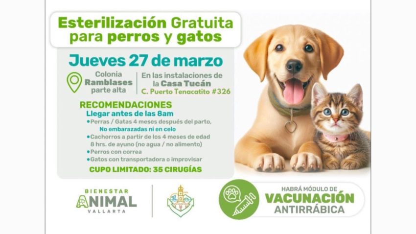 La Dirección de Bienestar Animal de Puerto Vallarta invita a la comunidad a participar en la Jornada de Esterilización Gratuita para perros y gatos, que se llevará a cabo este próximo jueves 27 de marzo en la Casa Tucán, ubicada en calle Puerto Tenacatito #326, en la Colonia Ramblases parte alta.