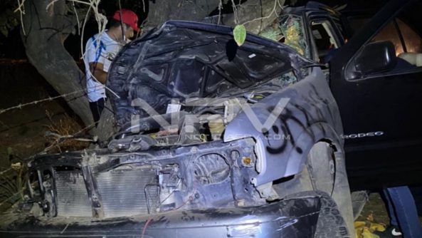 Las autoridades fueron alertadas poco después de las 22:00 horas de este domingo, en el sentido de que había un choque con prensados adelantito de la presa en mención, por lo que rápidamente acudieron varias unidades de Seguridad Pública Municipal, oficiales de vialidad y los cuerpos de auxilio, encontrando al llegar una camioneta marca Rodeo Isuzu, en color negro, con placas del Estado de Sonora, totalmente destrozada, luego de que se había estrellado contra un árbol de Guásima.