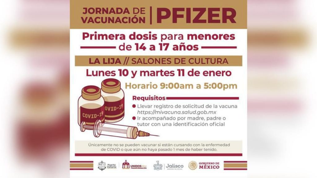 La jornada de vacunación en su primera dosis para menores de 14 a 17 años de edad, será en las instalaciones de los salones de cultura en el complejo deportivo de La Lija, ubicado en la parte alta en la delegación de El Pitillal.