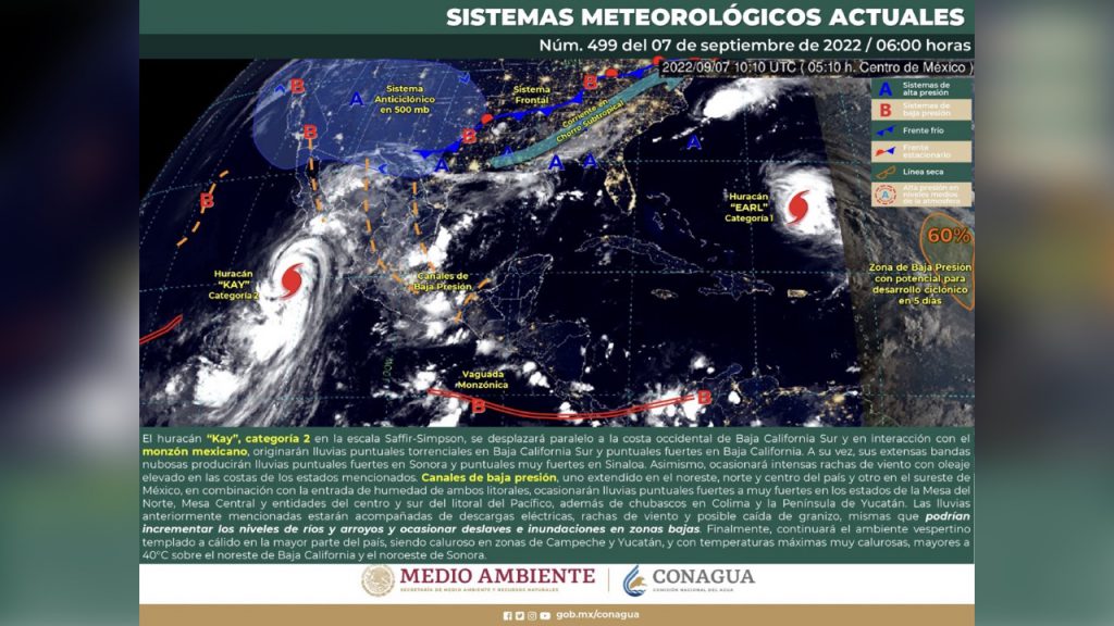Las extensas bandas nubosas de Kay, en combinación con el monzón mexicano, originarán lluvias torrenciales (de 150 a 250 milímetros [mm]) en Baja California Sur, muy fuertes (de 50 a 75 mm) en Durango, Jalisco, Michoacán y Sinaloa, y fuertes (de 25 a 50 mm) en Baja California, Nayarit y Sonora.