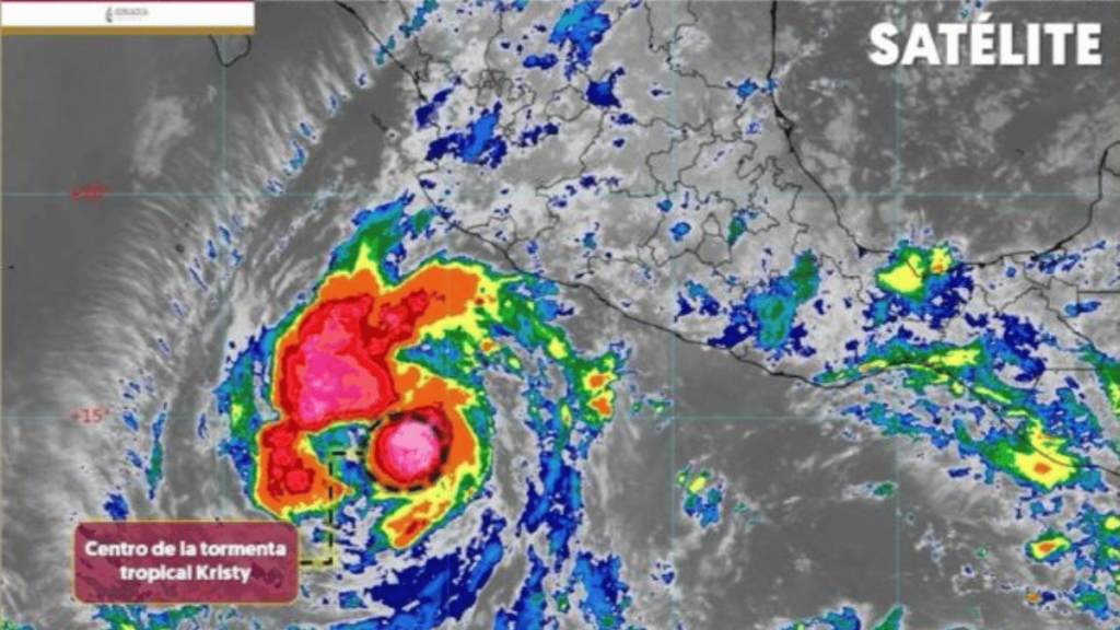 La tormenta tropical Kristy se mantiene activa frente a las costas de Jalisco y Colima, generando condiciones climáticas adversas en la región. Actualmente, Kristy se encuentra a 525 km al suroeste de Punta San Telmo, Michoacán, y a 755 km al oeste-suroeste de Acapulco, Guerrero. Se espera que continúe su desplazamiento hacia el oeste, alejándose gradualmente de las costas mexicanas.