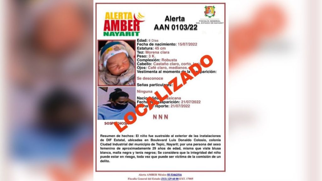 También es de mencionar que la Fiscalía del Estado de Nayarit informó, que para localizar a esta mujer y lograr el rescate del bebé recién nacido, se emitió Alerta Amber Nacional en los 31 estados de la República Mexicana y la Ciudad de México.