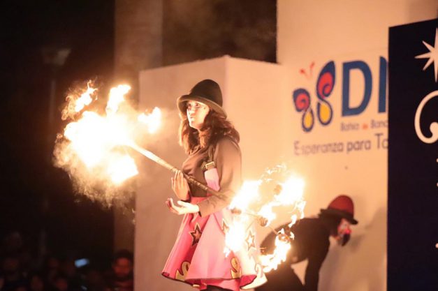 Previo al encendido del Árbol de Navidad, los ahí presentes rieron a carcajadas con las ocurrencias de los artistas cómicos que dieron vida a los personajes de “Rudy y Papitas Fritas” y que dibujaron caras de sorpresa cuando el monociclo se hizo presente en el escenario y el asombro no se hizo esperar entre los más pequeños, ya que hábilmente realizaron una rutina de malabares con fuego, contando con la aprobación de las familias reunidas que de manera constante dejaron escapar fuertes aplausos.