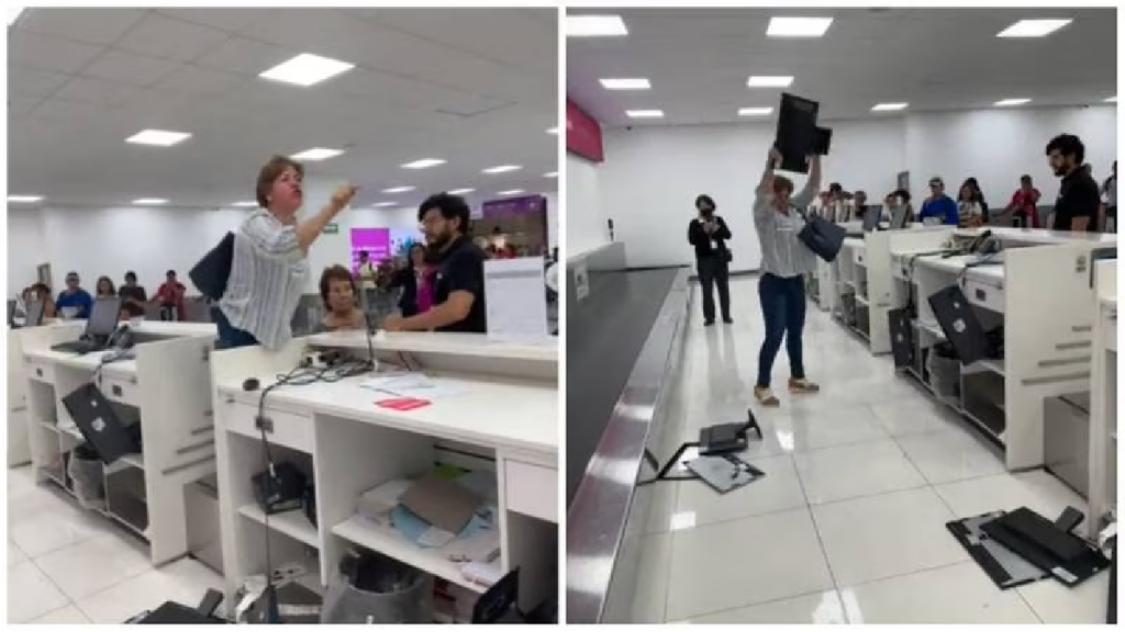 En un video, que fue viralizado en redes sociales, se aprecia cómo una mujer, molesta, reclama: “no me regresen mi dinero, me vale madre”, mientras destruye computadoras y teléfonos de la aerolínea.
