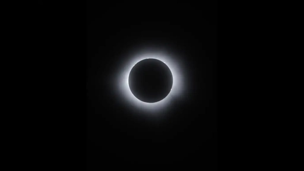 Desde el escenario, donde se amenizó la primera etapa de la parcialidad con música de cámara que ha sonorizado icónicas películas de ciencia ficción desarrolladas en el cosmos, como El Danubio azul, que acompañó una escena de 2001: Odisea del Espacio, o parte del soundtrack de La guerra de las galaxias, el científico explicaba al altavoz el proceso: apenas segundos antes de la totalidad apareció el anillo de diamantes. En los cuatro minutos del cenit se pudo testificar la aparición de la corona solar, el brillante aro que coronó la Luna. Un eclipse es –se detalló– el único momento para que los científicos puedan estudiar esta parte de nuestra estrella, pues en días habituales el ardiente brillo de su superficie impide su análisis.