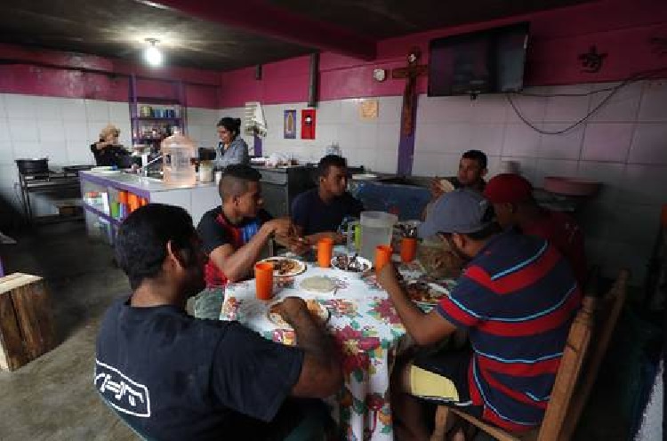 Julia Ramírez, veterana patrona, prepara abundantes huevos revueltos con jamón que voluntarias y patronassirven con frijoles, salsa y las tortillas que una empresa masera dona para este comedor, y para los alimentos voladores que pronto se irán en el tren. Menuda, silenciosa, eficaz. En torno a dos mesas se sientan una decena de jóvenes, la mayoría hondureños. Pernoctaron aquí y subirán al ferrocarril en las próximas horas, recién bañados y con ropa limpia cuando hay. Hoy es el caso. Según Norma, siempre presente, 80 por ciento de los migrantes que pasan por aquí son hondureños