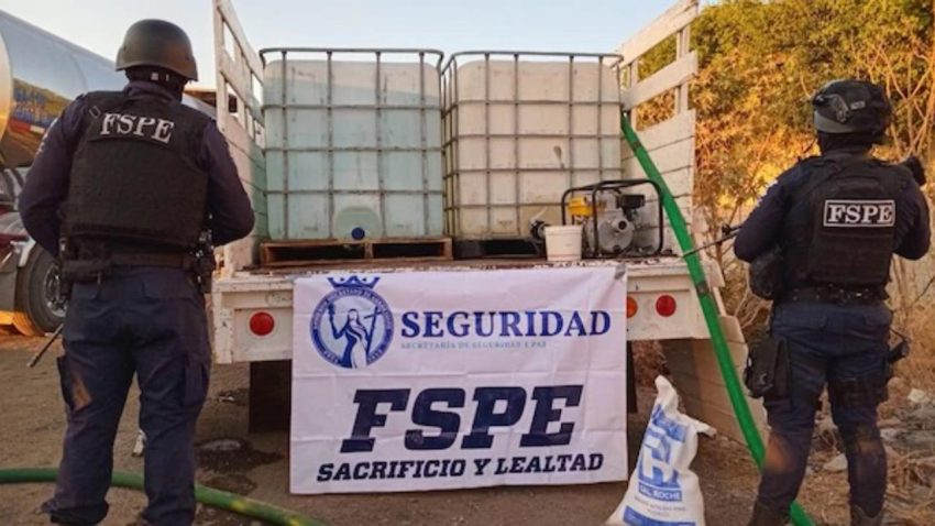 Como parte del operativo, fueron asegurados siete tinacos con capacidad para mil 200 litros cada uno, 20 tambos de 200 litros, pipas y una máquina extractora, los cuales son utilizados para extraer el líquido irregular.
