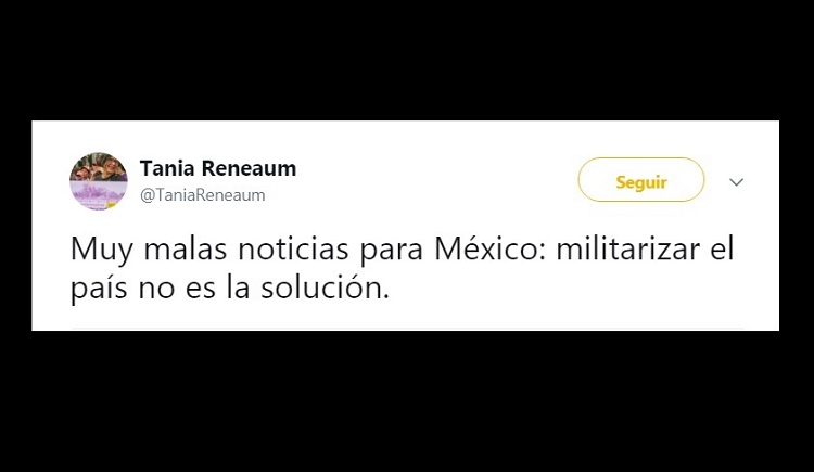 Reneaum indicó que esta aprobación es “preocupante” y añadió que “no podemos permitir que se normalice la participación de las fuerzas armadas en labores policiales, pues llevamos décadas documentando las violaciones de derechos humanos que prevalecen bajo el uso sostenido de las fuerzas armadas; al contrario, se tiene que pensar en un retiro progresivo a la par de una profesionalización de la policía”.