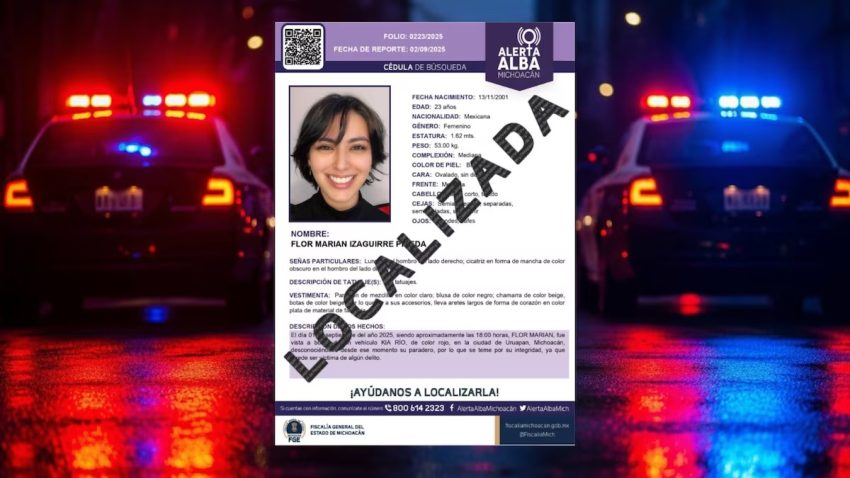 El hallazgo de la creadora de contenido mexicana fue confirmado por la Fiscalía General del Estado de Michoacán en un comunicado donde informa que se desactivó mecanismo de búsqueda de Alerta Alba, implementado en coordinación con la Fiscalía Especializada para la Investigación del Delito de Desaparición Forzada y Desaparición Cometida por Particulares.