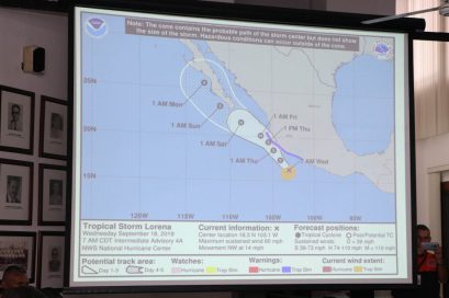 Adrián Bobadilla García, titular de la dependencia, precisó que el propio Víctor Cornejo López, jefe de la Unidad de Meteorología del Centro Universitario de la Costa de la UdeG, confirmó que a esa hora el meteoro se localizaba a 100 kilómetros al noroeste de Cabo Corrientes, rumbo a Baja California, con vientos sostenidos de 110 kilómetros por hora y desplazándose a una velocidad de 17 kilómetros por hora.