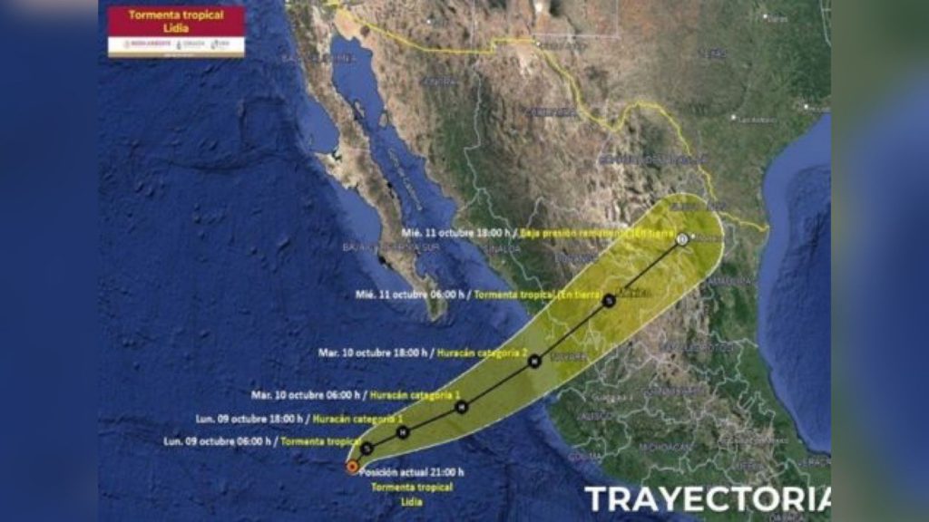 Según el pronóstico del Servicio Meteorológico Nacional, se espera que este lunes 09 de octubre, el fenómeno hidrometeorológico ‘Lidia’ alcance la categoría 1 de huracán, dirigiéndose hacia Jalisco, Nayarit y Sinaloa.