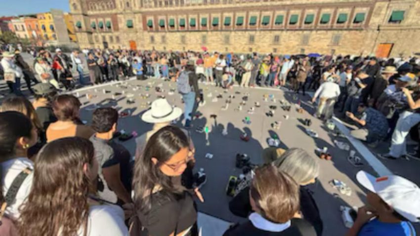 En el Zócalo de la Ciudad de México se congregaron colectivos, quienes encendieron 400 velas y colocaron 400 pares de calzado, en homenaje a las víctimas de Teuchitlán, Jalisco.