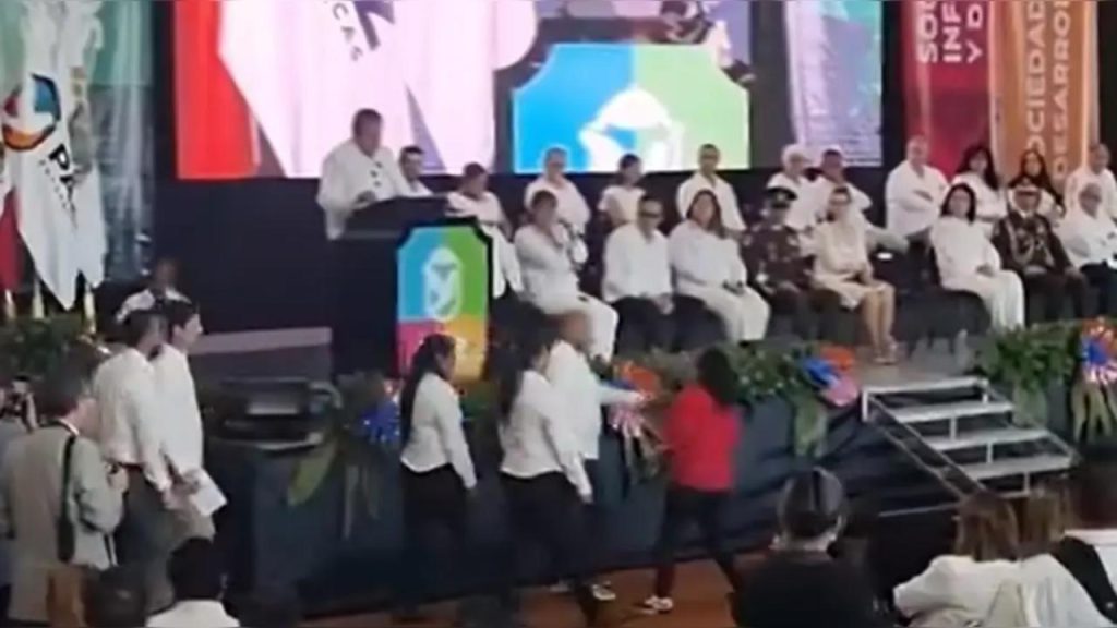 Llegó sorpresivamente y se plantó frente al atril donde el mandatario morenista ofrecía un mensaje; lo insultó durante unos segundos, hasta que personal de seguridad la tomó de los brazos y la sacó.