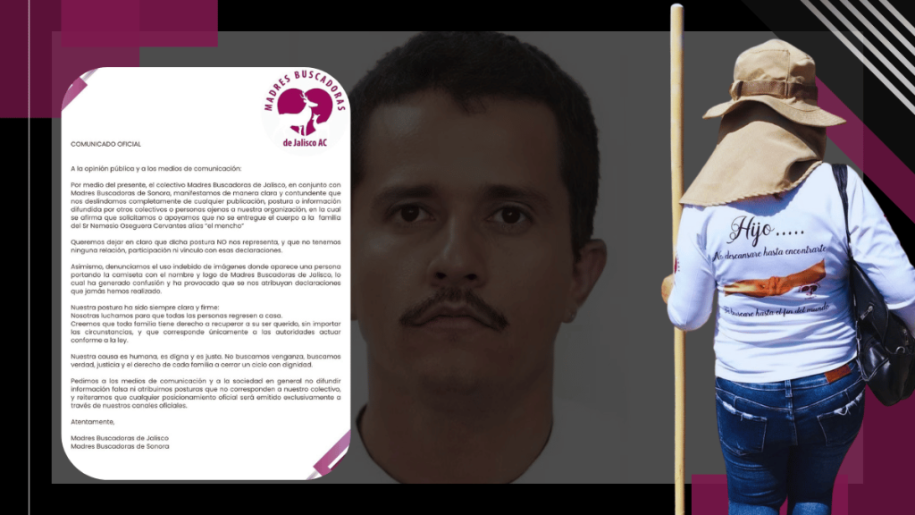El colectivo alertó sobre la difusión de fotografías donde personas ajenas portan sus logotipos para emitir juicios de valor sobre el caso de «El Mencho». Ante esto, pidieron a la población y a los medios verificar la información y no atribuirles agendas que no corresponden a su lucha por encontrar a sus desaparecidos. Concluyeron que cualquier decisión jurídica o forense sobre el cuerpo del fallecido es responsabilidad única de las autoridades del Estado.