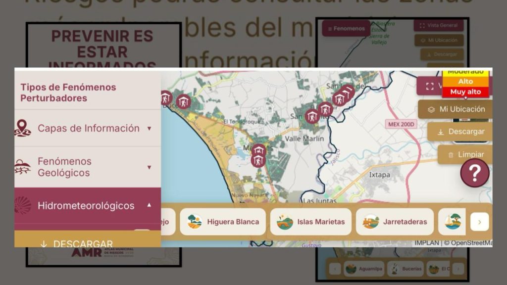 El mapa utiliza una interfaz intuitiva basada en un sistema de semáforo. Al navegar por las distintas localidades del municipio, los usuarios verán zonas marcadas en verde (menor peligro) hasta rojo (alto riesgo). Al hacer clic en cualquier punto, el sistema despliega datos específicos sobre la vulnerabilidad del área, acciones recomendadas antes de una contingencia y la ubicación exacta de los refugios temporales más cercanos.