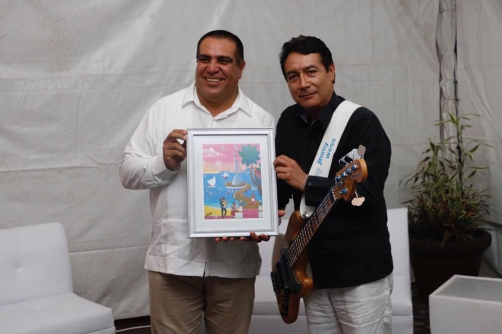 Previo a su salida al escenario, al filo de las 22:00 horas, donde ya los esperaban cerca de 20 mil personas, el alcalde Arturo Dávalos Peña, entregó a integrantes de la agrupación, un presente de Puerto Vallarta, como agradecimiento por haber aceptado presentarse en este aniversario del municipio.