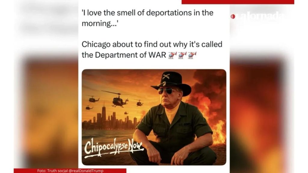 El mensaje va acompañado de una fotografía , generada por inteligencia artificial, con Chicago al fondo, helicópteros militares, un cielo rojo por las llamas de la guerra y el título “Chipocalypse Now”, en alusión a la película “Apocalypse Now”.
