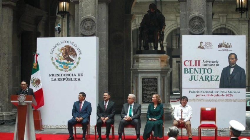 La funcionaria elogió la gestión de López Obrador porque “él ha sentado las bases de la Cuarta Transformación, a la que dará continuidad, por decisión popular, en un hecho inédito, la primera presidenta de México, Claudia Sheinbaum Pardo, porque, como dice la frase juarista, con el pueblo todo, sin el pueblo nada.”.