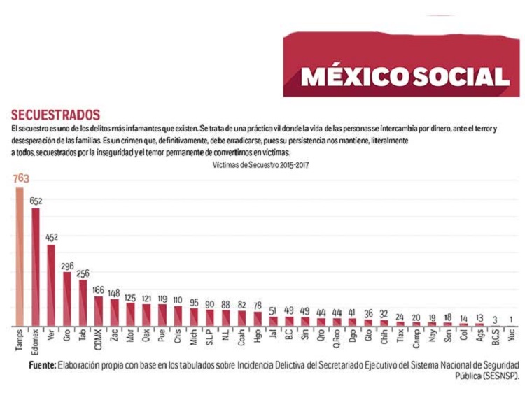 Los datos oficiales muestran que del 2015 al 2017 se tiene registro de cuatro mil 99 víctimas de secuestro; y 78% de los casos se concentra en sólo 11 entidades del país, en las cuales se tiene una contabilidad de más de 100 casos en el periodo señalado: Tamaulipas con 763 víctimas; Estado de México con 652; Veracruz con 452; Guerrero con 296; Tabasco con 256; Ciudad de México con 166; Zacatecas con 148; Morelos con 125; Oaxaca con 121; Puebla con 119; y Chiapas con 110 casos.