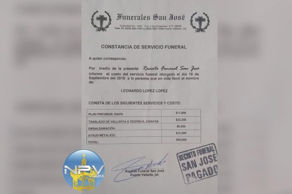 Se exige a la Fiscalía General de Nayarit publique factura del pago a la línea aérea que la Funeraria San José pago por el traslado del cuerpo del indígena, Leobardo López López quien falleció el pasado 16 de septiembre 2019 por atropellamiento. Porque es falso que a la funeraria se le pago 50 mil pesos con esta fecha. Apenas este sábado 28 de diciembre 2019 el cuerpo llegó a Tuxtla Gutiérrez, capital de Chiapas a las 3 de la tarde y a su comunidad arribó a las 10 y media de la noche. Ministerio Público de Jarretaderas, Sergio Virgen, no obligó al responsable pagar gastos funerarios, esto se dio luego de la presión de ciudadanos que vieron en estado de indefensión al hermano de Leobardo que desde principios de diciembre arribó a Bahía de Banderas en busca de justicia