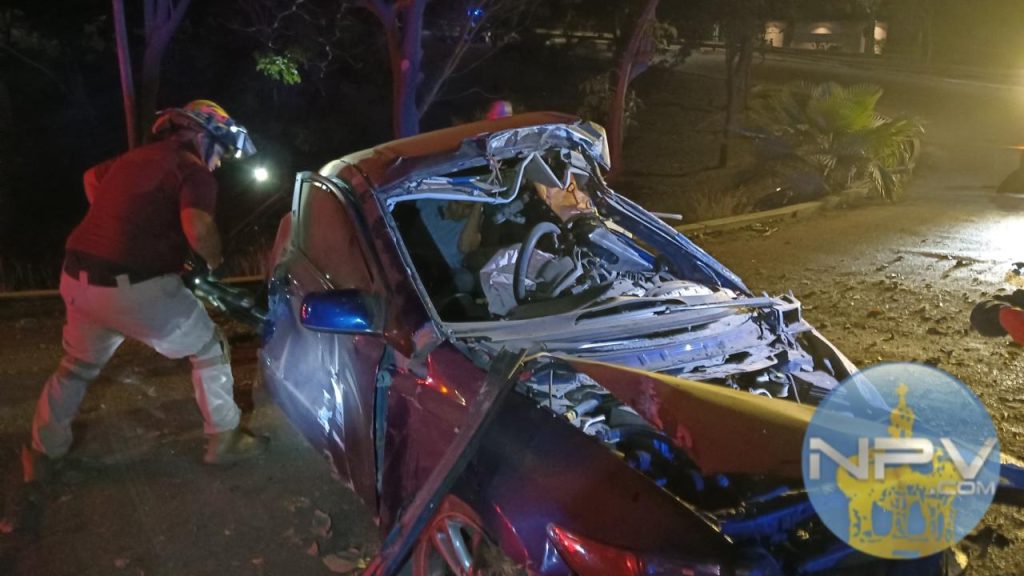 El percance ocurrió durante la madrugada de este sábado, cuando un automóvil, presuntamente debido al exceso de velocidad, perdió el control, chocó contra un árbol y terminó volcado y destrozado.