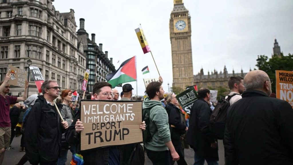 Algunas de las pancartas de los congregados rezaban lemas como «Los migrantes son bienvenidos, Trump no es bienvenido», «No al racismo, no a Trump» o «Bombardear niños en Gaza y festejar en Reino Unido».