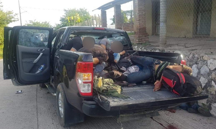 En una de las fotografías se observan los cadáveres de cuatro personas arriba de la batea de una camioneta tipo Pick Up, color negra, entre cuyas pertenencias se observa diversos objetos entre los que sobresale el arma de asalto.