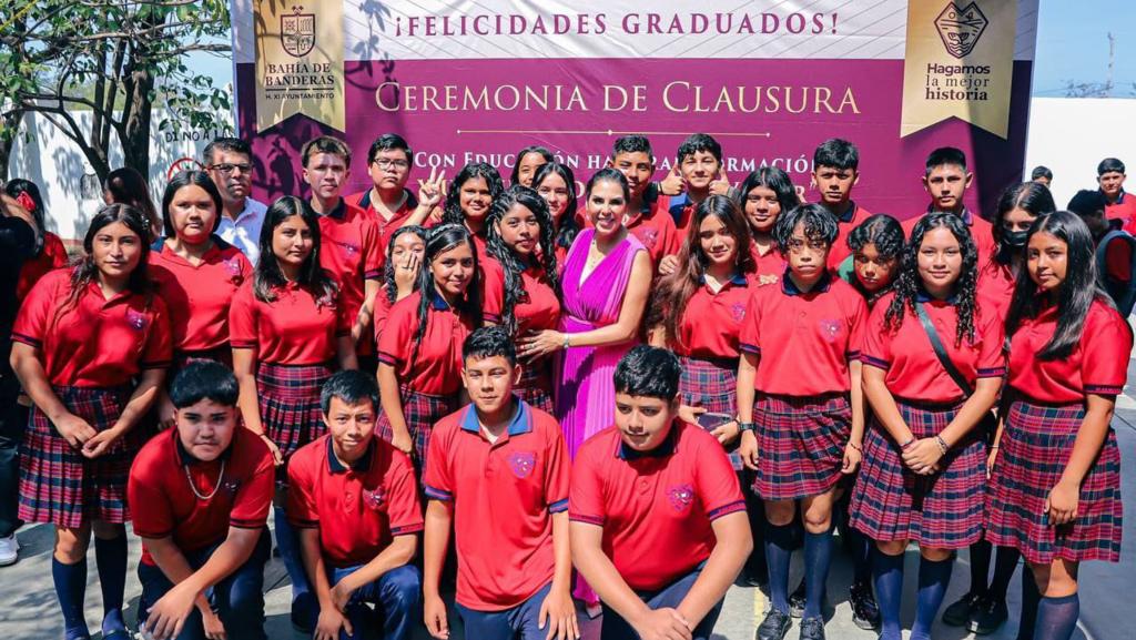 Bahía de Banderas Nay., 6 de julio de 2023.- Comprometida en todo momento con la educación en Bahía de Banderas, la presidente municipal, Mirtha Villalvazo, estuvo la mañana de este jueves en el cierre del ciclo escolar de la Telesecundaria Ramón Flores, ubicada en El Porvenir.