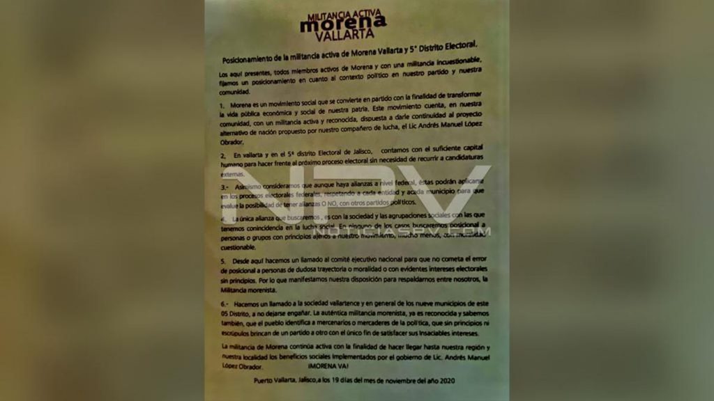 En un manifiesto que leyeron actores de la vida de MORENA en el municipio de Puerto Vallarta, se externaron algunos puntos: