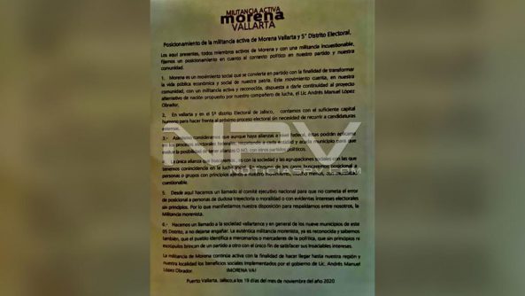 “Hacemos un llamado a la sociedad vallartense y en general de los nueve municipios de este distrito, para no dejarse engañar. La auténtica militancia morenista, ya es reconocida y sabemos también que el pueblo identifica a mercenarios o mercaderes de la política, que sin principios ni escrúpulos brincan de partido a otro con el fin de satisfacer sus insaciables intereses”.