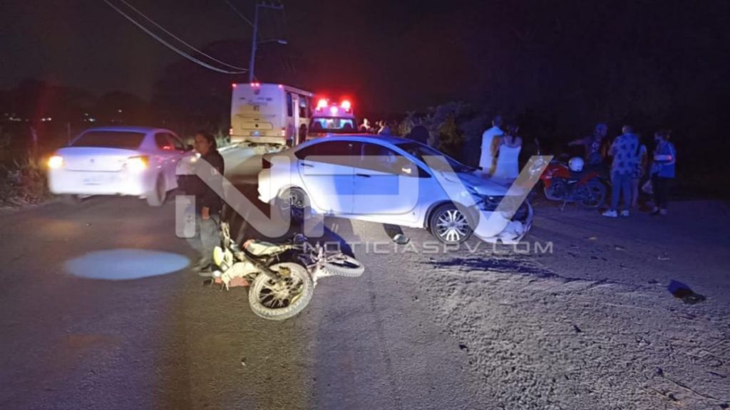 Aparatoso choque entre una motocicleta y un auto compacto que dejó como saldo una persona lesionada y daños considerables de registro la noche de este lunes entre los fraccionamientos Los Angeles y La Misión, en San Vicente, Bahía de Banderas, frente a Ex Haciendas San Angel.