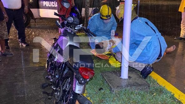 Motociclistas resultaron lesionados tras derrapar y chocar contra una camioneta al circular a exceso de velocidad sobre la avenida José Ponce, en San José del Valle, los cuales fueron auxiliados por Paramédicos de Protección Civil, quienes los trasladaron a recibir atención médica a un hospital.(José Luis Preciado/NoticiasPV.Com).