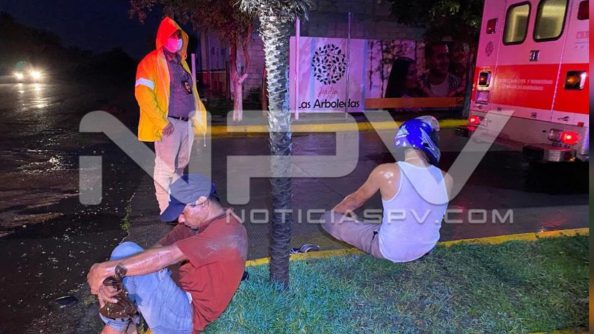 Motociclistas resultaron lesionados tras derrapar y chocar contra una camioneta al circular a exceso de velocidad sobre la avenida José Ponce, en San José del Valle, los cuales fueron auxiliados por Paramédicos de Protección Civil, quienes los trasladaron a recibir atención médica a un hospital.(José Luis Preciado/NoticiasPV.Com).