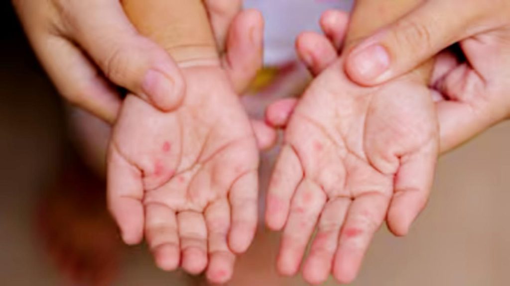 La enfermedad ocasiona la aparición de una multitud de pequeñas manchas rojas, semejantes a la picadura de una pulga y que va acompañada de un lagrimeo, estornudo, tos, fiebre, ojos rojos y otros síntomas catarrales.