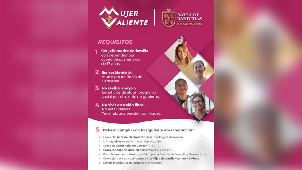 Para recibir el beneficio de Mujer Valiente, los se requiere ser jefa de familia con hijos menores de 17 años, residir en Bahía de Banderas, no contar con ningún otro apoyo social por parte del gobierno, y no vivir en unión libre, estar casado o contar con una pensión por viudez.