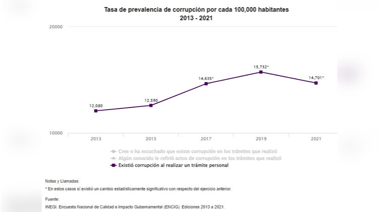 Ciudad de México. La percepción de corrupción, además de la victimización y la incidencia, sigue siendo muy elevada, ya que nueve de cada 10 personas en México la percibe como frecuente o muy frecuente, toda vez que los actos de corrupción le costaron a los mexicanos poco más de 9 mil 500 millones de pesos, reveló la Encuesta Nacional de Calidad e Impacto Gubernamental (ENCIG) 2021.
