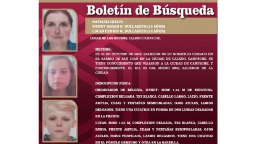 SAN FRANCISCO, Cam. (apro).- Una familia originaria de Bélgica desapareció en el estado de Campeche el 23 de octubre. La Comisión Local Búsqueda de Personas detalló en una ficha de búsqueda que se trata de Natacha Gielis y sus hijos adolescentes, Wendy Sarah Dullaerts de 15 años de edad y Lucas Cedric Dullaerts de 12 años de edad.